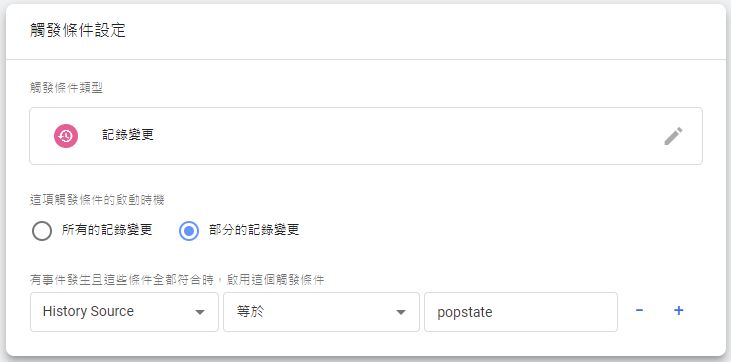 接著再到選單的《觸發條件》新增一個「記錄變更」的觸發條件,讓 「History Source」等於「popstate」即可,這裡沒用「hashchange」是因為 gtm.historyChange 不會用 hashchange 進行事件觸發,改用 popstate 才會正常。