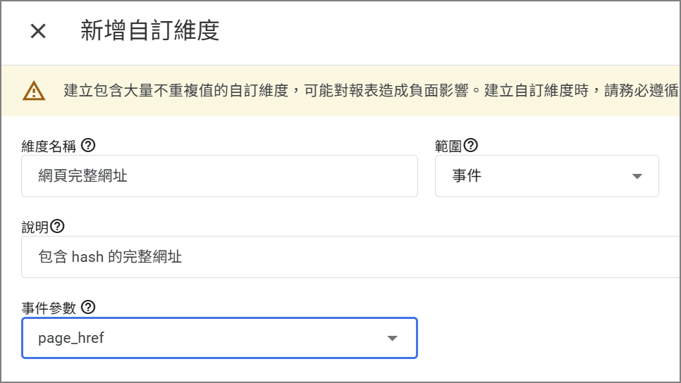 以上 GTM 的部分完成,接著進入 Google Analytics 頁面,點擊左下角的「管理」再找到「資料顯示」下的「自訂定義」接著按下「建立自訂維度」在「時間參數」的欄位輸入「page_href」其他欄位則隨意輸入,範例如下圖