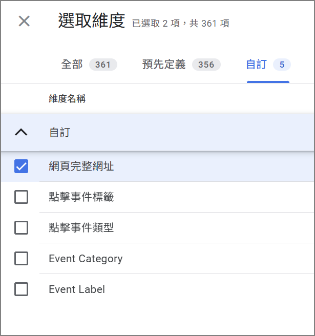 日後使用 GA 的探索報表,就可以在增加維度的時候在「自訂」分頁中調出含有 hash 的完整網址了